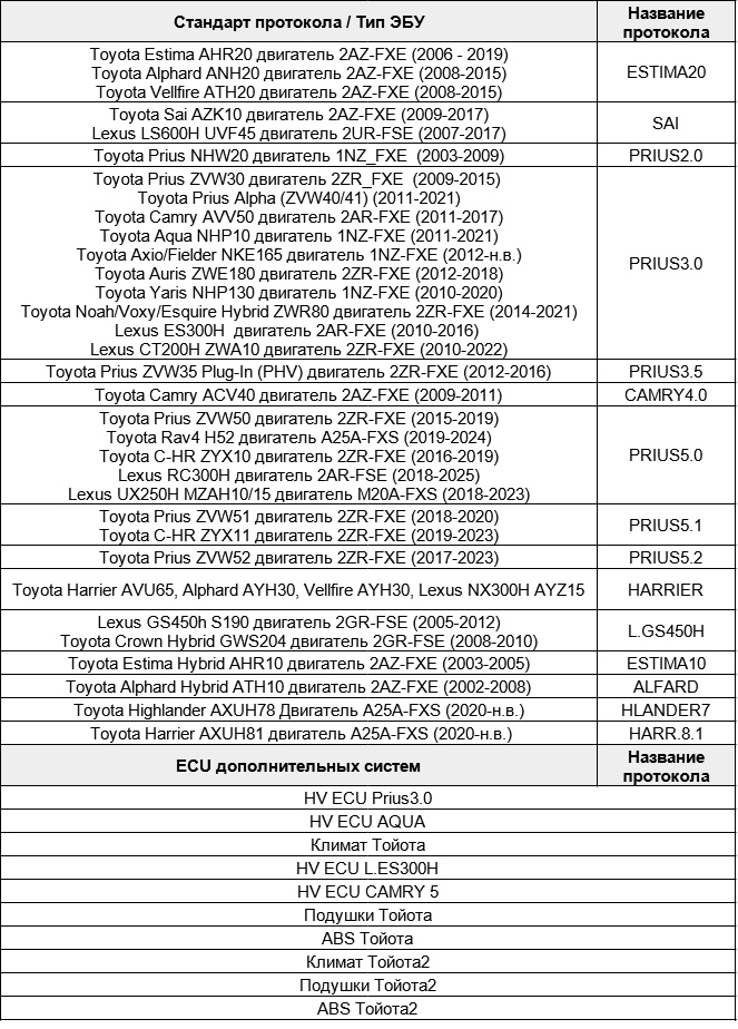 Toyota, Lexus - гибриды ?совместимые модели а/м, подробная информация в описании прибораAlfard / Camry 4.0 / Estima10 / Estima20 / HLander 7 / Harrier / Harrier 8.1 / Lex GS450H / Lex RX400H / Lex RX450H / Prius 2.0 / Prius 3.0 / Prius 3.5 / Prius 5.0 / Prius 5.1 / Toyota Sai Дополнительные системы гибридных а/м Toyota, Lexus