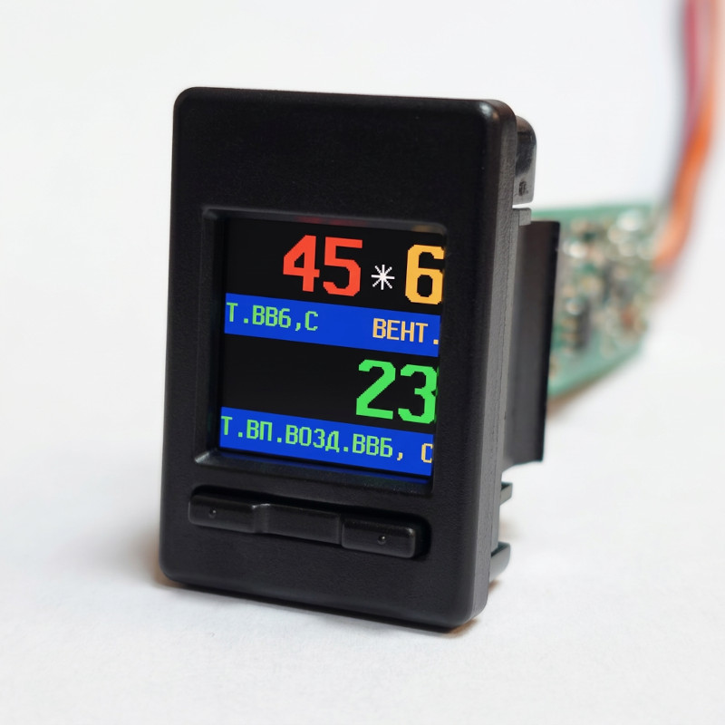 Имеет цветной дисплей, с настройкой цветов пользователем. При превышении установленной границы параметра, помимо предупреждения, параметр красится красным цветом. Два параметра на дисплее одновременно. Текстовые подписи параметров, текстовые меню, текстовые предупреждения.